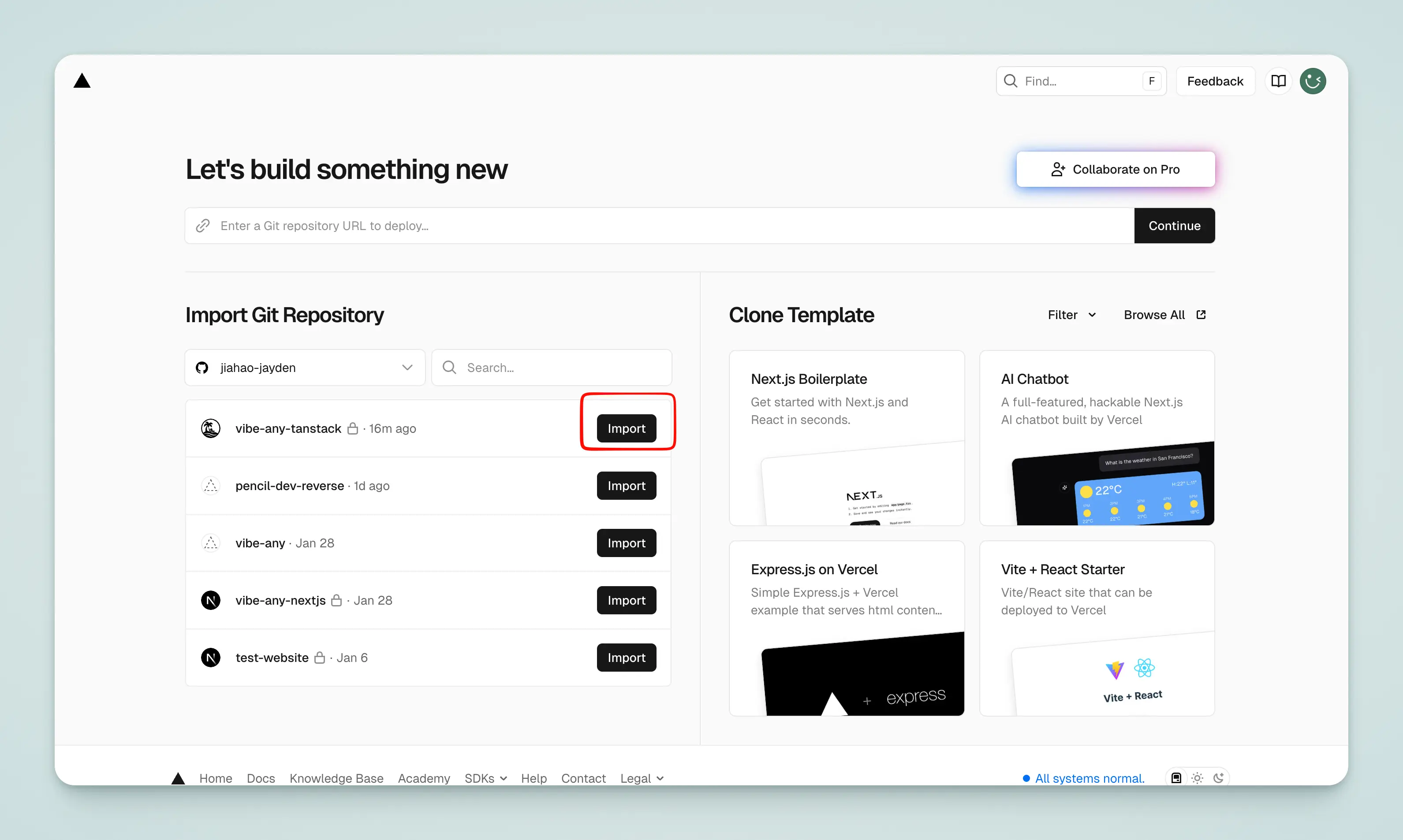 Open Vercel, click Import, and select your repository to complete the import.