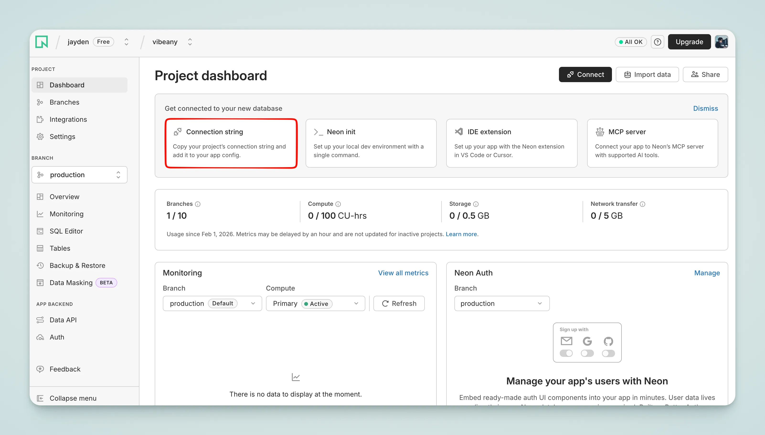 Neon is a Serverless PostgreSQL service. The database automatically sleeps when idle and charges based on actual usage. The free tier provides 0.5 GB storage per project, 100 CU-hours of compute time, and up to 10 projects.