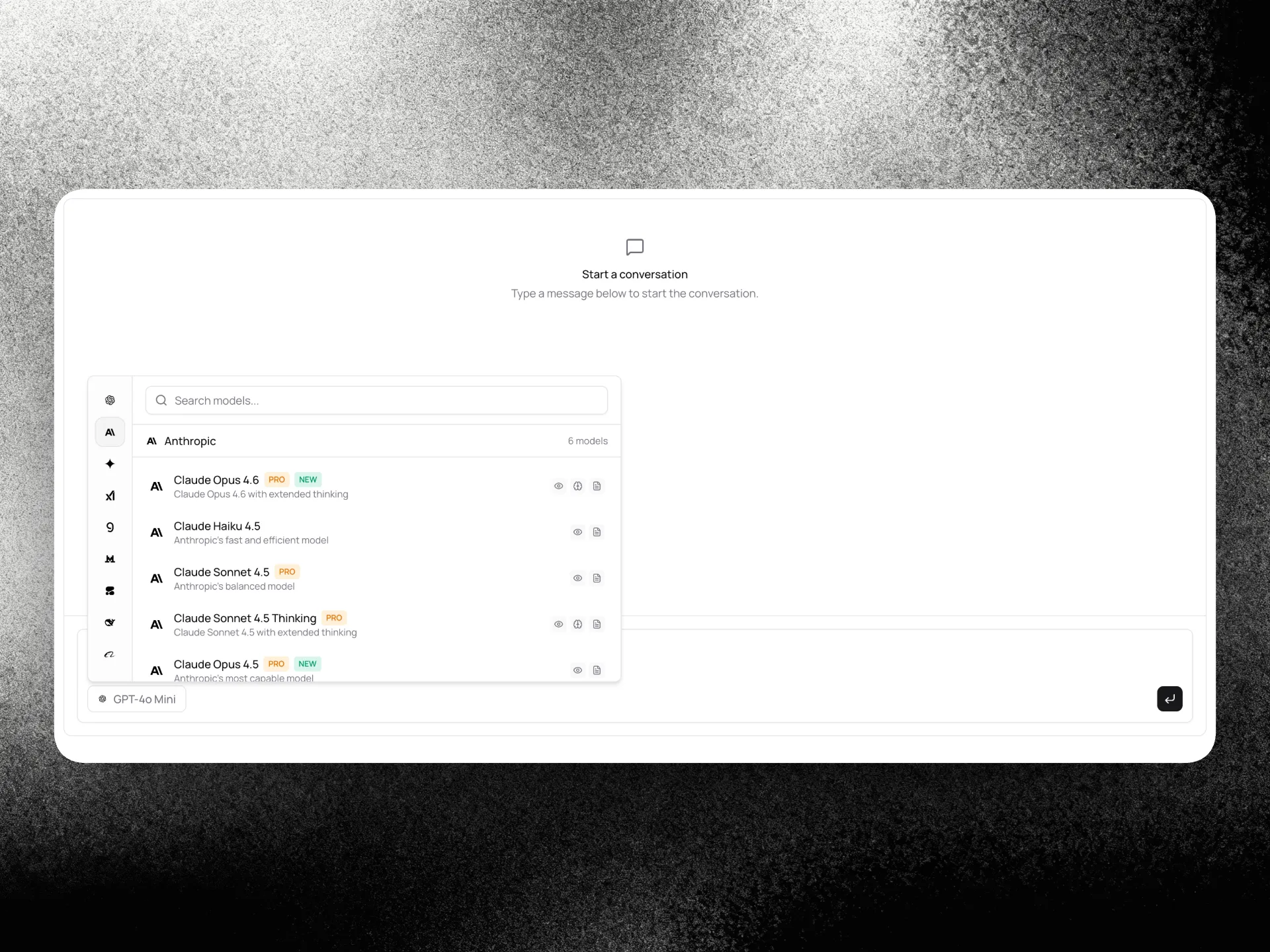 支持多模型选择(OpenAI、Anthropic、Google、DeepSeek、Groq、Mistral 等)、会话管理和多服务商支持