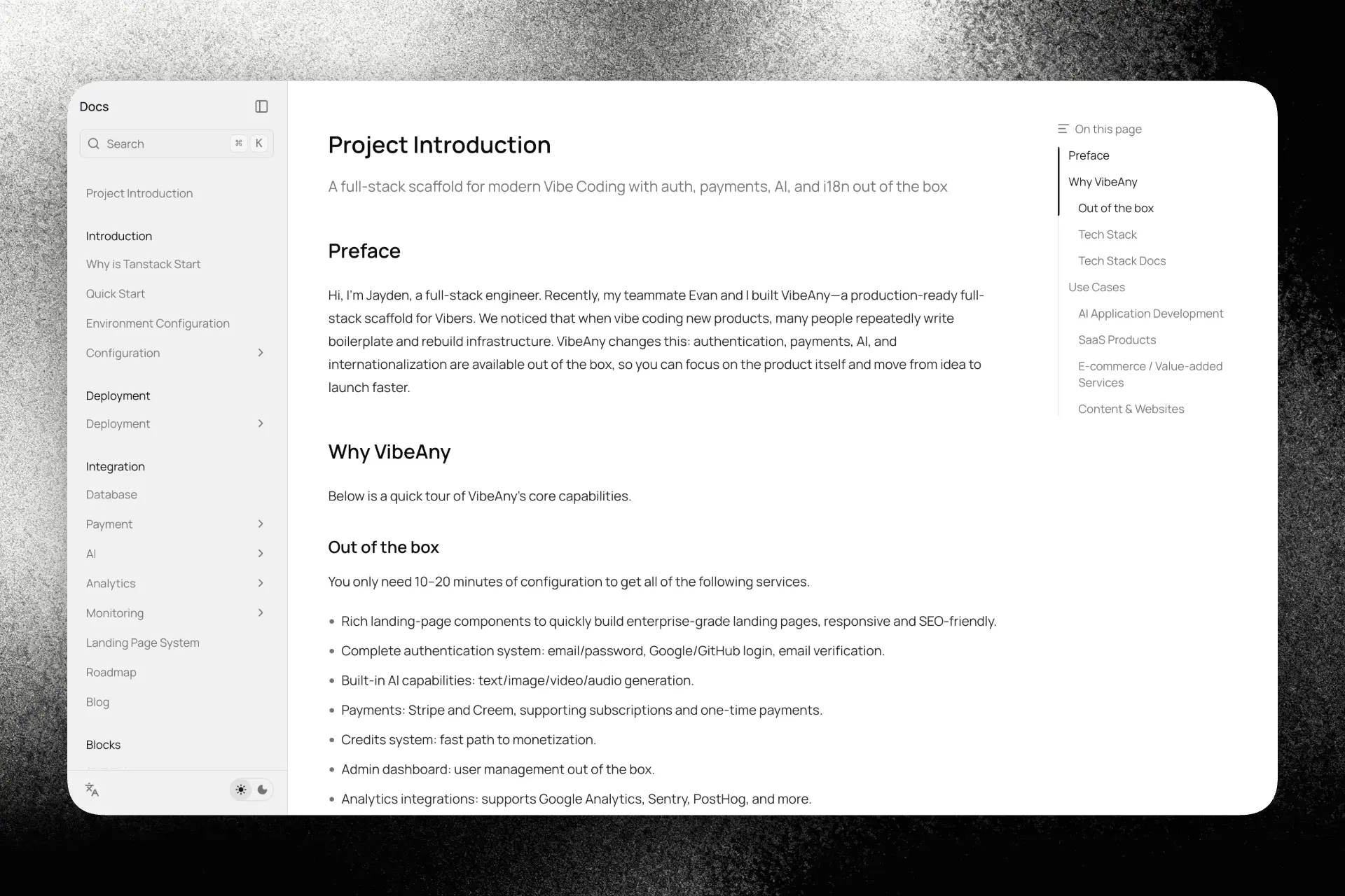 VibeAny 是一个 TanStack Start 模板,用于构建 AI SaaS 创业项目。快速集成数据库、认证、支付、AI、国际化等能力。