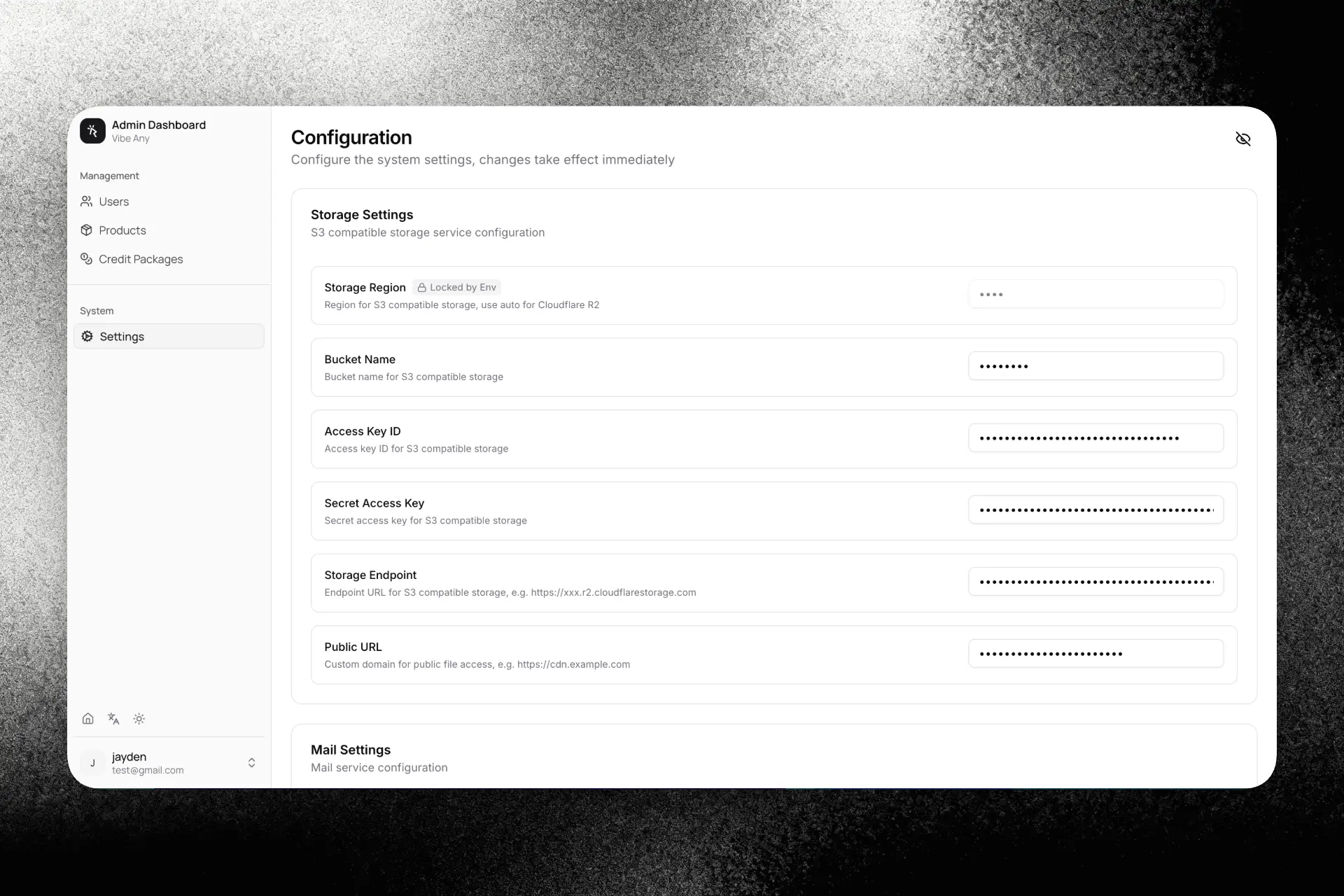 通过友好界面配置支付、邮件、存储和 AI 设置